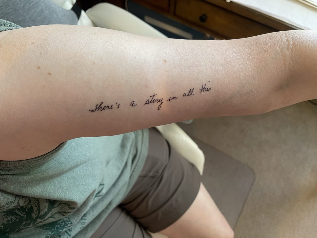 She died in March 2023, but, she was gone way before that due to Alzheimers. In the year and a half since she died I have repeated that phrase, “there’s a story in all this” to myself many times. I got it tattooed on my arm (exactly as it was handwritten in her journal) as a reminder. Sometimes when I am navigating a tricky situation (there have been many since her death) I find myself rubbing the spot on my arm.