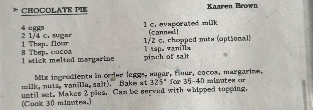 My first actual recipe post, and I am already cheating (sort of). This isn’t technically from my mom’s recipe files. It came from an old church cookbook that (I think) came from my Grandmother on my dad’s side. I am not sure when my mom started making this recipe, but I can tell you that once my husband, Danny, and I started dating it quickly became his favorite dessert. When I started going to Danny’s holiday family events, my mom would make this recipe (it makes 2 pies) and I would swing by her house before heading to the event to take as my contribution to the meal.