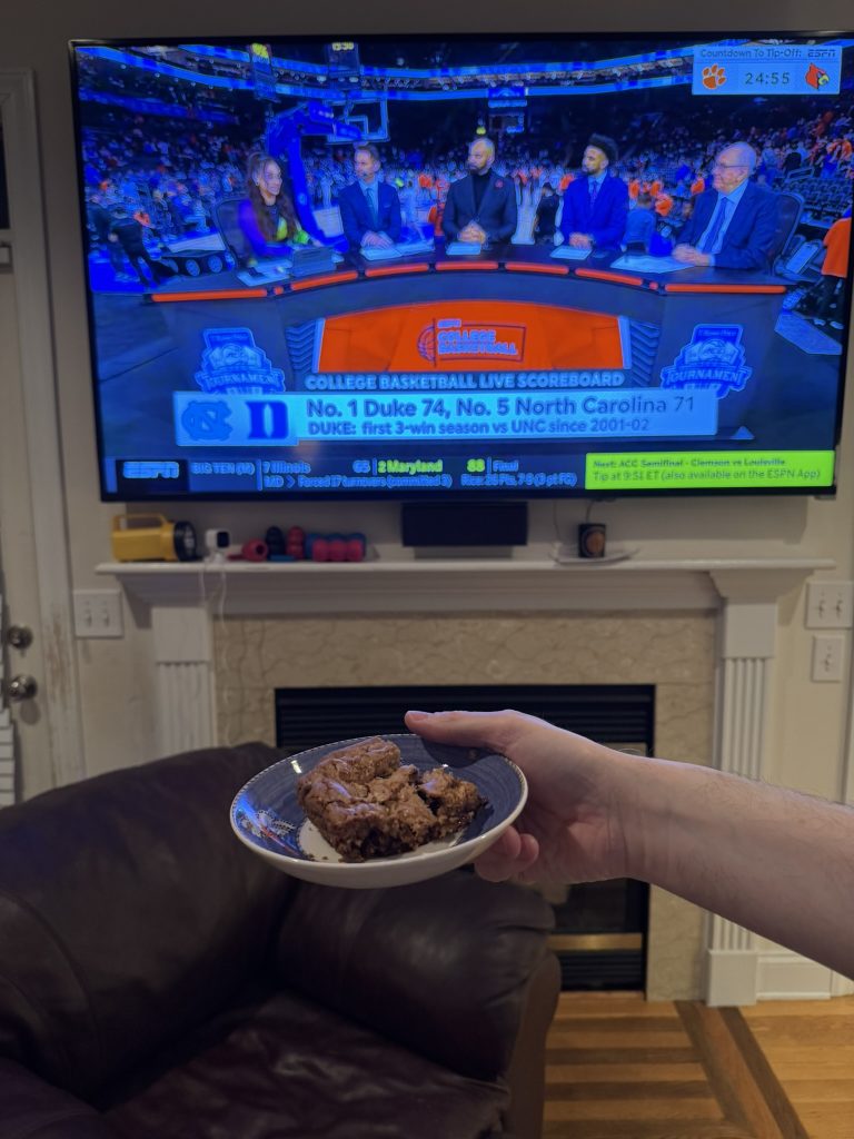 I did, however, decide to make these Toll House pan cookies last weekend while watching basketball. I bought all the ingredients ahead of time but didn’t read through the recipe and once I set out to start making it saw the “1 C. butter, softened.” I, of course, had not thought to set out butter to soften which threw off my entire plan to make these cookies to enjoy during Duke/UNC round 3 in the ACC tournament.